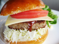 低温熟成・自家製天然酵母のソフトなパン。ジューシーなハンバーグ、エメンタールチーズ・キャベツ・トマト・ピクルス